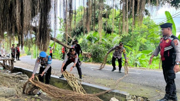 Dengan sigap personil Polsek Nusa Penida bersama BPBD, PLN dan warga mengevakuasi pohon tersebut agar tidak mengganggu pengguna jalan yang akan melintasi tempat tersebut.