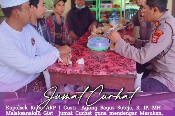 Gentra.co.id Bali – Polda Bali -Polres Karangasem -Polsek Kubu, Sebagai upaya untuk menyerap secara langsung keluhan dari masyarakat, Kapolsek Kubu Polres Karangasem AKP. I Gusti Agung Bagus Suteja, S. IP.MH didampingi Kanit Reskrim Ipda I Wayan Putu Eka Saputra SH. , dan Anggota kembali melaksanakan Progam giat Rutin Mingguan yakni Program Jumat Curhat.