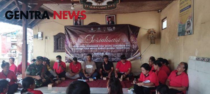 Gentra News Bali, Bangli – Dalam persiapan menyambut Pemilihan Kepala Daerah (Pilkada) Serentak 2024, Babinsa Koramil 01/Bangli, Kodim 1626/Bangli Peltu I Ketut Udayana menghadiri kegiatan sosialisasi Pemilihan Gubernur dan Wakil Gubernur Bali, serta Bupati dan Wakil Bupati Bangli Tahun 2024. Kegiatan ini bertujuan untuk meningkatkan kesadaran dan partisipasi masyarakat dalam proses demokrasi, sekaligus memastikan pelaksanaan Pilkada berlangsung aman dan tertib, kegiatan dilaksanakan di Balai Banjar Dadia Puri, Desa Bunutin, Kecamatan Bangli, Kabupaten Bangli. Sabtu (26/10/24).