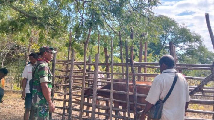 NTT-NAIKLIU — Babinsa Oepoli yang juga tergabung dalam Satuan Penugasan Teritorial (SATGASTER) Kodim 1604/Kupang, Sertu Dematrius Jelabing, bersama tim dari Dinas Peternakan Kabupaten Kupang, melaksanakan vaksinasi hewan ternak pada hari kedua di Dusun II, Desa Netemnanu Selatan, Kecamatan Amfoang Timur Kab. Kupang. Kegiatan ini bertujuan mencegah penyebaran penyakit pada hewan ternak, khususnya sapi, yang menjadi sumber penghidupan utama masyarakat. Rabu (25/06/2025).