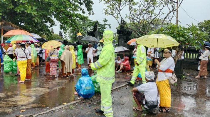 Hujan Deras, Bhabinkamtibmas Desa Tojan Polsek Klungkung Amankan Kegiatan Melasti