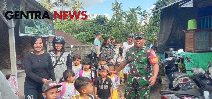 Tampak di lokasi dengan penuh sabar dan humanis, Serma Wayan ikut aktif membantu para guru memotivasi anak-anak mengenal sekolah dan lingkungannya.
