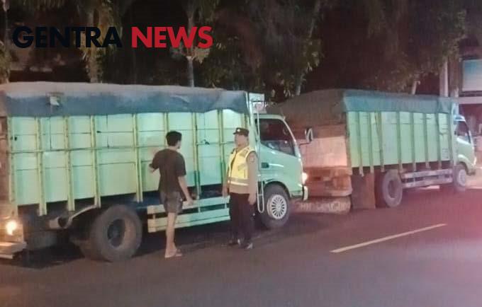 Terpantau Kapolsubsektor Candidasa Aiptu I Wayan Suwardika bersama anggota memberikan imbauan kepada para sopir truk muat material pasir untuk tidak parkir di bahu jalan Jalan Raya Candidasa -Amlapura yang cukup padat arus lalu-lintasnya, Sabtu (3/8) malam.
