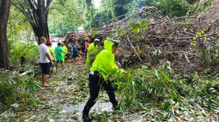 Gentra.co.id BaliĀ – Personel Kepolisian dari Polsek Banjarangkan dan Satuan Lalu Lintas Polres Klungkung mendatangi lokasi tanah longsor yang terjadi di jalan utama yang menghubungkan Kabupaten Klungkung dengan Gianyar, tepatnya di sebelah timur jembatan Tukad Melangit, Desa Tusan, Banjarangkan, Klungkung (12/1/2025).