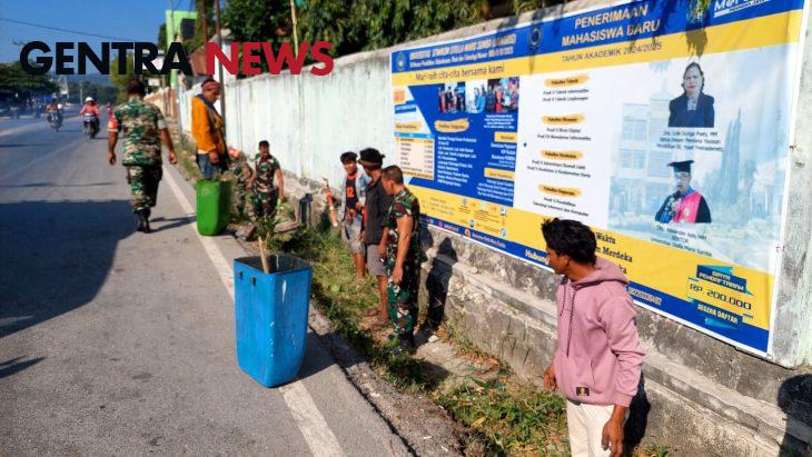 kerja bakti dalam hal ini yang dilaksanakan di wilayah binaan Koramil 01/Laratama,diantaranya di pinggir jalan dan sampah di got sepanjang jalan.