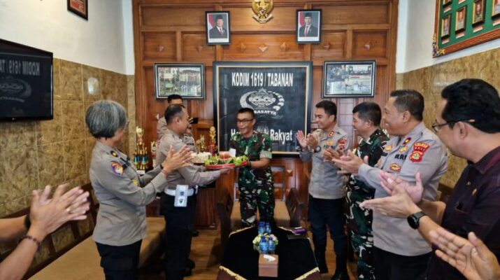 Polda Bali – Polres Tabanan – Humas Tabanan. Dalam rangka mempererat sinergitas dan soliditas antara TNI dan Polri, Kapolres Tabanan AKBP Candra C. Kesuma, S.I.K., M.H., bersama para pejabat utama Polres Tabanan memberikan ucapan selamat ulang tahun ke-49 kepada Kodim 1619/Tabanan pada Kamis (8/5/2024). Kegiatan berlangsung di Makodim 1619/Tabanan, Jalan Katamso No. 02, Desa Dajan Peken, Kecamatan Tabanan, dan disambut hangat oleh Kasdim Mayor Kav I Nyoman Arya Jayantara beserta jajaran Kodim.