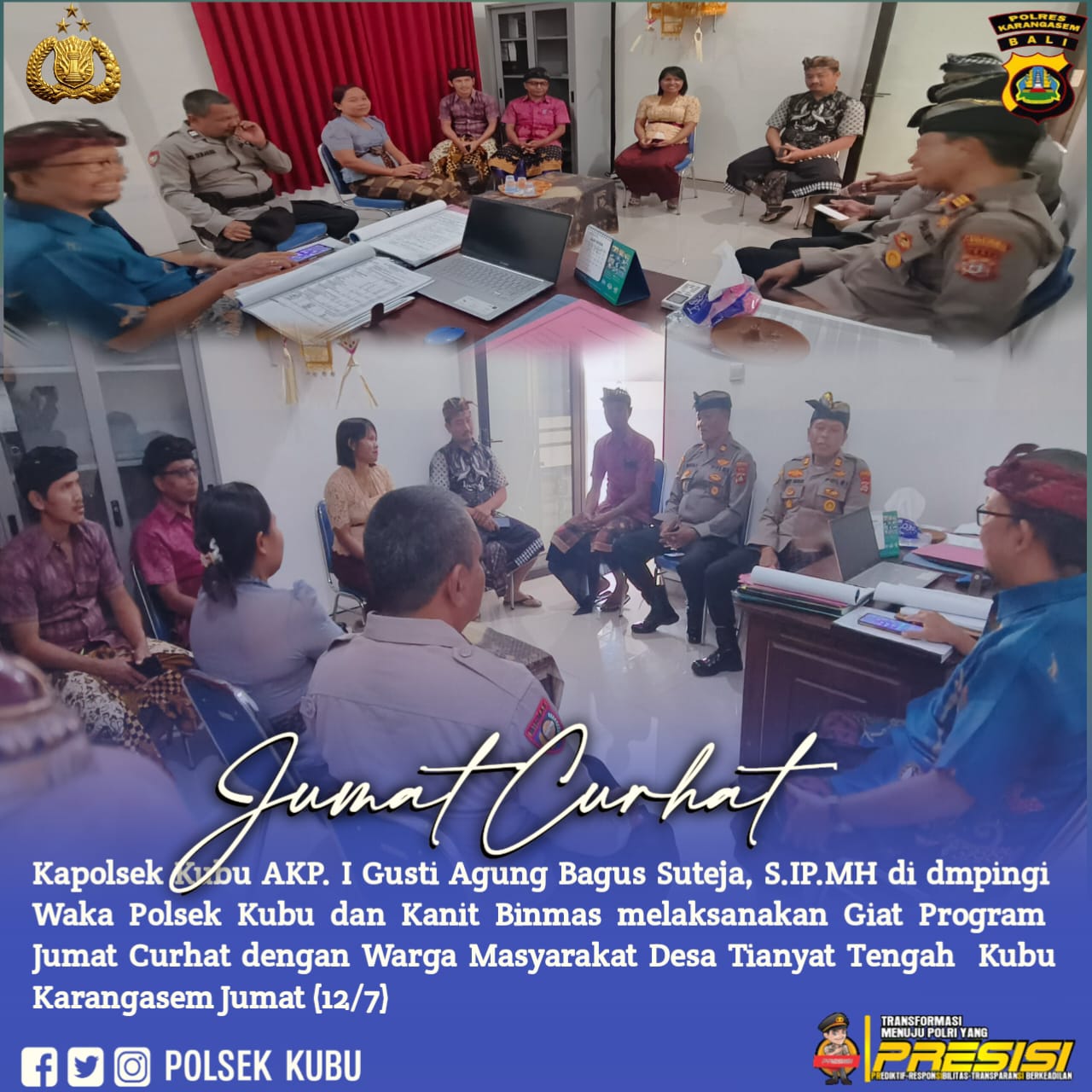 Hari ini Kapolsek Kubu melaksanakan giat jumat curhat dengan Warga masyarakat Desa Tianyar Tengah bertempat Kantor Desa Desa Tianyar Tengah Karangasem yang dihadiri oleh 20 warga masyarakat, termasuk Perbekel Tianyar Tengah I Nyoman Rumia SE, Perangkat Desa,Para Kawil dan tokoh masyarakat setempat