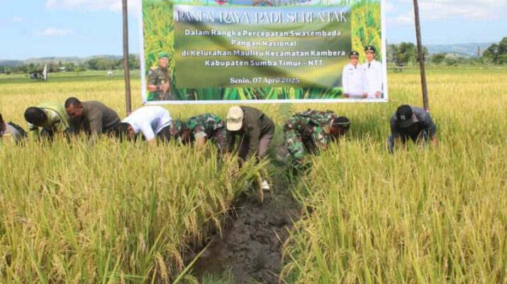 Gentra.co.id Dalam Rangka meningkatkan ketahanan pangan Kepala Staf Kodim 1601/Sumba Timur Mayor Inf. Sambudi bersama Forkopimda dan Anggota Kodim 1601/Sumba Timur melaksanakan Panen Raya padi serentak di Kelurahan Mauliiru, Kecamatan Kambera, Kabupaten Sumba Timur, Senin (07/04/2025)