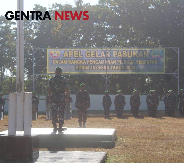 Gentra News NTT-SBD/Dalam rangka mengamankan Pemilihan Kepala Daerah (Pilkada) Tahun 2024, Dandim 1629/SBD di wakili Kasdim 1629/SBD Mayor Inf Idris, memimpin pelaksanaan apel gelar pasukan di Lapangan upacara Makodim 1629/SBD, Jl. Ir. Soekarno, Desa Watukawula, Kecamatan Kota Tambolaka, Kabupaten Sumba Barat Daya, Rabu (17/07/2024).