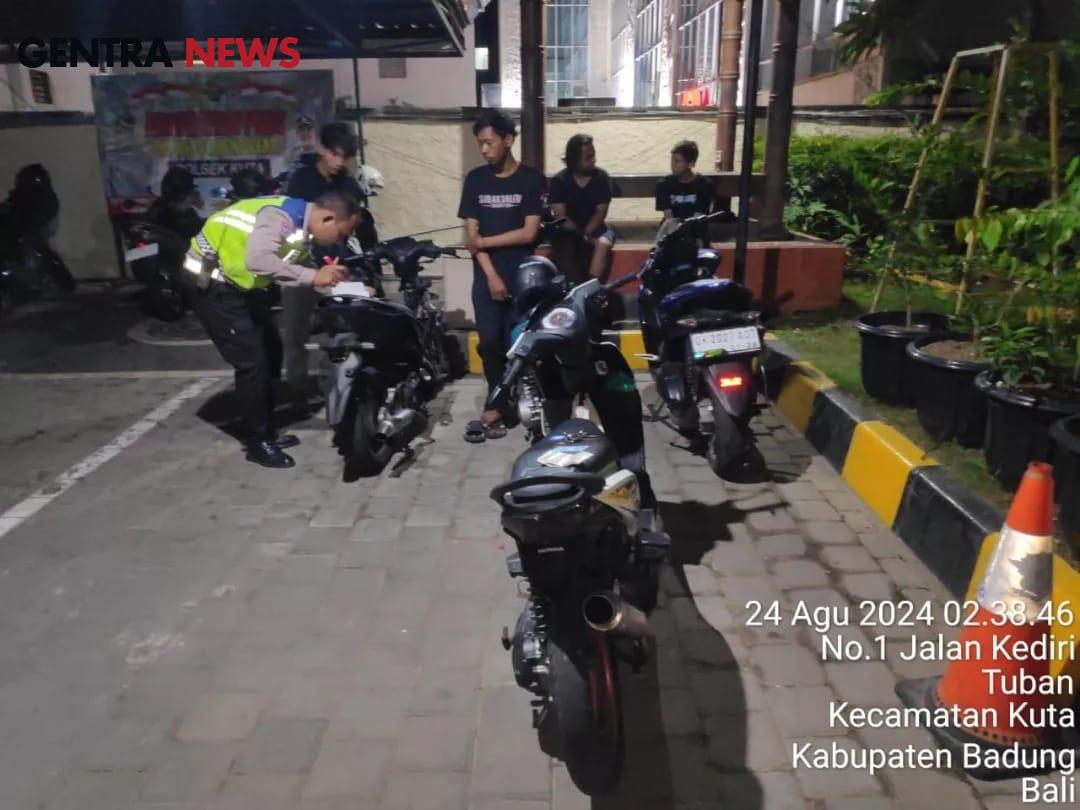 Sabtu (24/8/2024), Subuh ditemui di Mako Polsek AKP I Ketut Agus Pasek Sudina,S.I.K,.M.H Kapolsek Kuta mengatakan” patroli gabungan Polsek Kuta yang dipimpin Perwira pengawas Iptu I Nyoman Wina,S.H saat melintasi wilayah By Pas Ngurah Rai menemukan gerombolan anak muda (ABG) melintas dinjalan bypas Ngurah Rai dari arah bundaran tol ngurah rai menuju simpang Dewa Ruci dengan menggunakan kendaraan tanpa plat tanda nomor kendaraan (TNKB) dan suara kenalpot bising tidak sesuai specifikasi kemudian dilakukan pemberhentian dan pemeriksaan, didapat beberapa kendaraan tidak sesuai aturan.