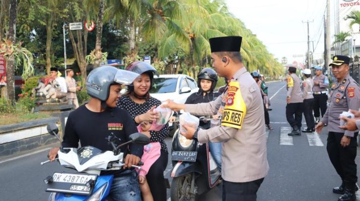 Gentra.co.id Bali – Tabanan, Polda Bali – Dalam semangat kebersamaan dan kepedulian di bulan suci Ramadhan, Kapolres Tabanan AKBP Chandra C. Kesuma, S.I.K., M.H., bersama Pejabat Utama (PJU), personel kepolisian, serta awak media menggelar aksi sosial dengan membagikan takjil gratis kepada masyarakat. Kegiatan ini berlangsung pada Kamis (13/3) di depan Mapolres Tabanan, Jalan Pahlawan, tepatnya di depan Apotek Kimia Farma 2. Dimulai pukul 16.00 s/d 16.45 Wita, ratusan bungkus takjil berupa kolak dan kue dibagikan kepada para pengendara yang melintas.
