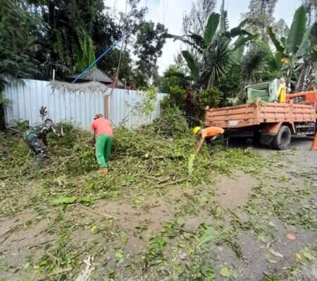 Babinsa bersama petugas DLH bahu-membahu memotong dan membersihkan ranting-ranting pohon dari badan jalan agar tidak membahayakan pengguna jalan maupun masyarakat sekitar. Berkat kerja sama yang baik, proses pembersihan dapat diselesaikan dengan cepat dan lancar sehingga jalan kembali dapat dilalui secara normal.