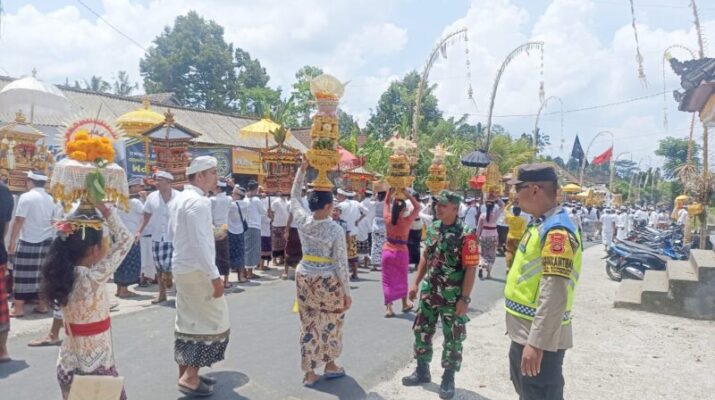 Bangli – Babinsa Desa Bangbang Koramil 1626-03/Tembuku, Pelda Kadek Widiarta, bersama Bhabinkamtibmas dan Pecalang Desa Adat Bangbang melaksanakan pengamanan kegiatan upacara keagamaan di Desa Bangbang, Kecamatan Tembuku, Kabupaten Bangli, Rabu (01/10/2025).