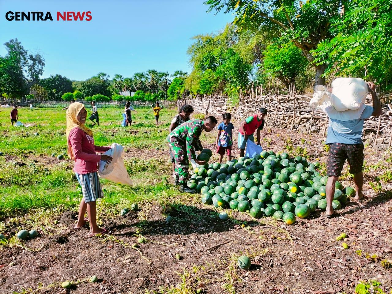 Gentra News NTT Rote Ndao Rote Ndao — Berlokasi di Desa Kuli Aisele Kecamatan Lobalain Kabupaten Rote Ndao.Babinsa Koramil 01/Ba’a Kodim 1627/RN Koptu Alis Sinlae terjun langsung Gotong Royong bersama warga bantu panen Semangka milik Bapak Soleman Thine, dalam kegiatan ini merupakan wujud kebersamaan TNI yang merupakan bagian dari Masyarakat apalagi dalam hal bergotong royong.