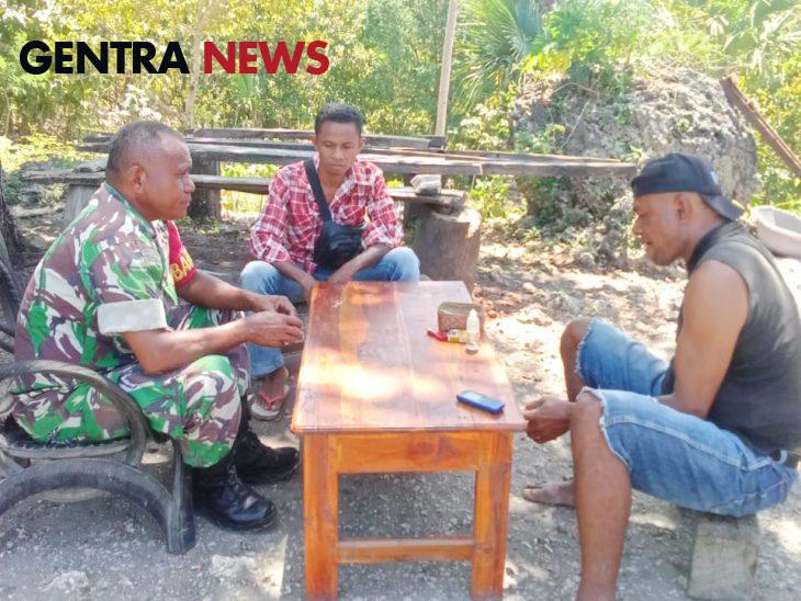 Gentra News NTT – KODIM 1605/BELU, Babinsa Desa Saenama Koramil 1605-09/Biudukfoho Sertu Stanis Mali Seran dalam melaksanakan pemantauan wilayah binaannya melakukan Komsos dengan warga masyarakat di Dusun Akarlaran, Desa Saenama, Kecamatan Rinhat, Kabupaten Malaka NTT, Sabtu (31/8/2024).