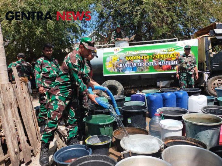 Gentra News NTB – Sumbawa, Dalam rangka mengurangi kesulitan masyarakat akibat kekeringan, Koramil 1607-06/Lape melakukan pendistribusian air bersih kepada warga Dusun Bukit Tinggi, Desa Dete, Kecamatan Lape, pada Selasa (22/10/2024).