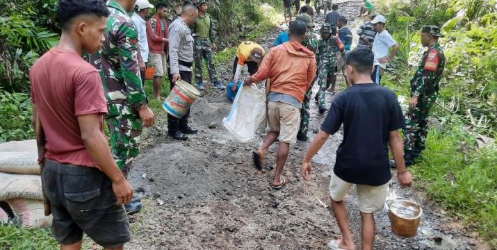 Gentra.co.id NTT – Desa Langgo, Kecamatan Satarmese – 19 Desember 2024 Danramil 1612-07/Satar Mese, Kapten Inf Roberto Carlos, bersama 10 anggota TNI melaksanakan Karya Bhakti/Gotong Royong bersama masyarakat untuk memperbaiki jalan rusak yang menghubungkan Desa Langgo dan Desa Satar Loung serta akses menuju Puskesmas Langgo. Kegiatan tersebut berlangsung di Kampung Langgo, Desa Langgo, Kecamatan Satarmese, Kabupaten Manggarai.