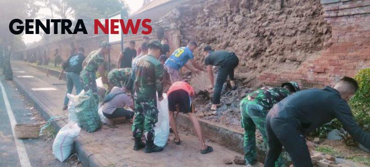 Gentra News Bali – Gianyar – Blahbatuh, Koramil 1616-04 Blahbatuh kerahkan personil lakukan pembersihan dan merapikan material reruntuhan tembok penyengker Puri Blahbatuh Kanginan di Jln Kebo Iwa yang roboh sepanjang kurang lebih 4 m tinggi 2 m, setelah gempa yang menguncang pada pukul 07.26 dengan kekuatan 4,8. di wilayah Gianyar. Sabtu (21/9/2024)