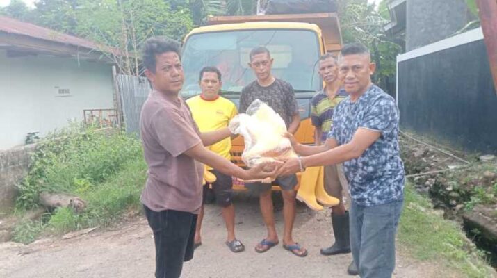 Gentra.co.id –Ketua RT. 26, Pns. Daud Anakay menyerahkan secara langsung dukungan 5 sepatu bot kepada para Petugas angkut sampah didepan bak sampah Asrama TNI
