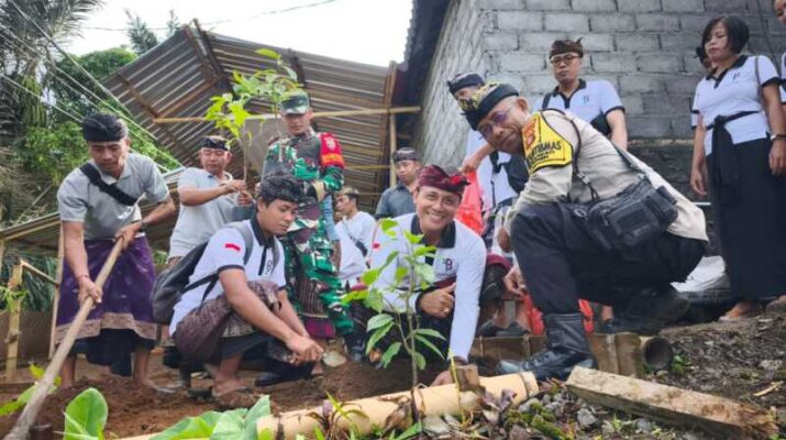 Babinsa Desa Sinduwati Koramil 1623-04/Sidemen Serda I Made Durma Yasa menghadiri kegiatan penanaman pohon di sekitaran Pura Dalem Suci Banjar Dinas Kikian, Desa Sinduwati,