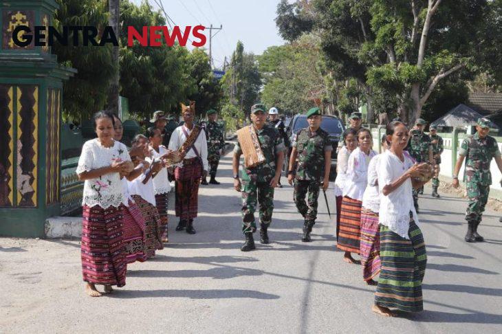 Asisten Latihan Kepala Staf Angkatan Darat (Aslat KASAD) Mayjen TNI Jonathan Binsar Parluhutan Sianipar disambut sapaan adat hase hawaka dan pengalungan tais oleh Dandim 1605/Belu selanjutnya menerima laporan dari Pos jaga Satri Makodim 1605/Belu serta menerima jajar kehormatan dari regu jaga satri.