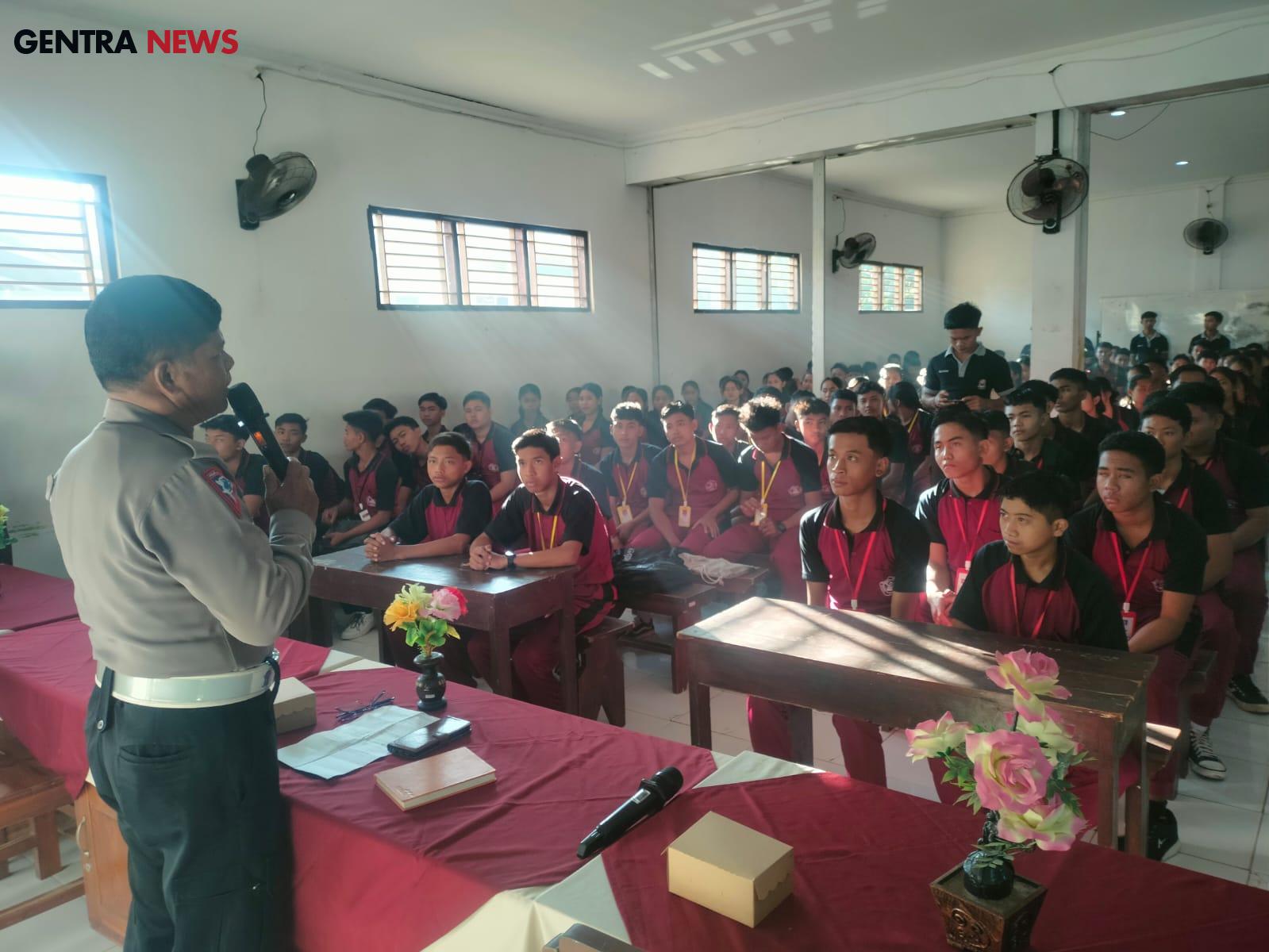 Melalui kegiatan Masa pengenalan Lingkungan Sekolah, Kanit Lantas Polsek Kubu Ipda I Gusti Nyoman Getas Memberikan pembinaan dan Pembekalan kepada 162 Peserta Siswa Didik Baru SMK Nusa Dua Toya Anyar