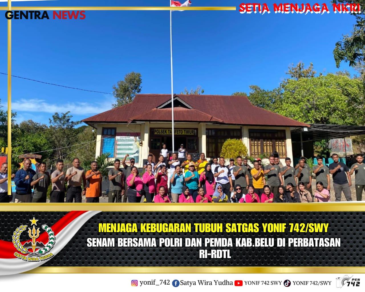 Menjaga Kebugaran Tubuh Satgas Yonif 742/SWY Senam Bersama Polri dan Pemda Kabupaten Belu di Perbatasan RI-RDTL
