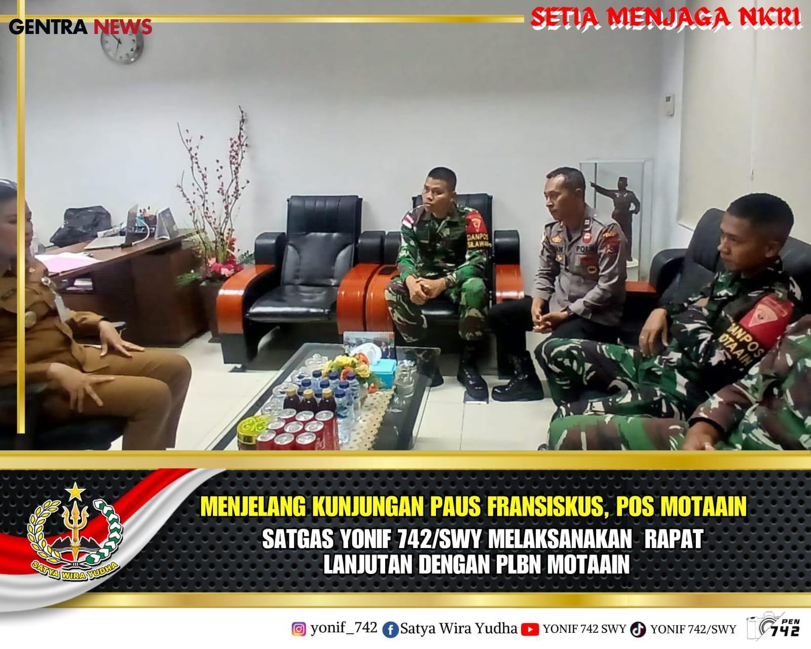 Gentra News NTT – Belu, Satgas Pamtas RI-RDTL Yonif 742/SWY melaksanakan rapat lanjutan dengan Kepala Adminstrator PLBN Motaain (Ibu Maria Farimah Rika, S.SRP) dan Kepolisian Pos Motaain (Aiptu Imam Sukadi). Selasa (3/8/2024)