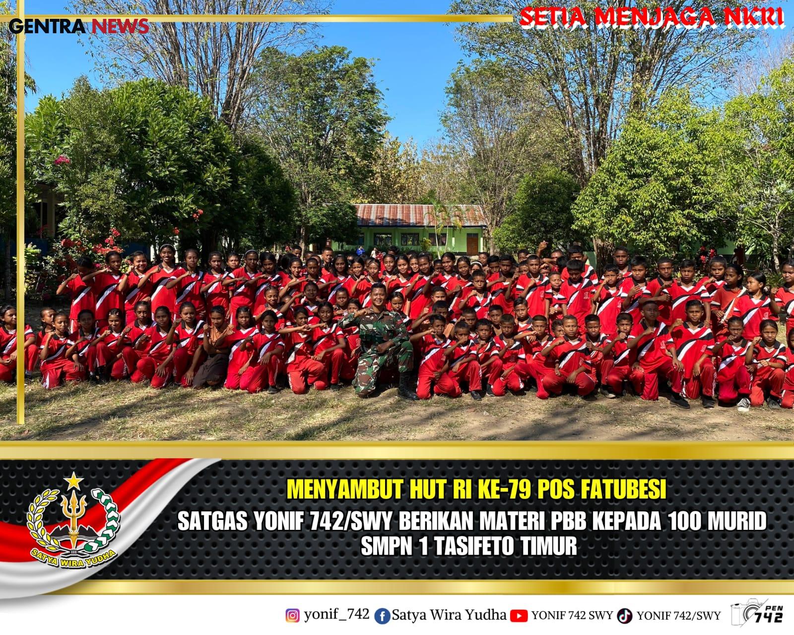 Gentra News Belu, NTT – Persiapan Menyambut HUT RI ke-79 pada tanggal 17 Agustus 2024, Satgas Pamtas RI-RDTL Sektor Timur Yonif 742/SWY yang dipimpin Letkol Inf Trijuang Danarjati, S.A.P., (Dansatgas) rutin turun kesekolah-sekolah untuk memberikan materi dan melatih baris berbaris kepada para murid, seperti halnya yang dilakukan oleh Pos Fatubesi Atas Kipam II yang melatih PBB kepada 100 Murid SMPN 1 Tasifeto Timur. Minggu (21/7/2024)