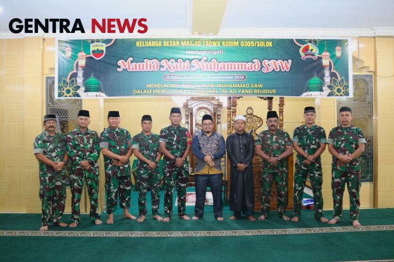 Gentra News Sumbar – Personel Kodim 0309/Solok dan Persit Kartika Candra Kirana Cabang LXIII Kodim 0309/Solok mengikuti peringatan Maulid Nabi Muhammad SAW 1446 H/2024 M di Masjid Taqwa Makodim 0309/Solok, Rabu (18/9/24).