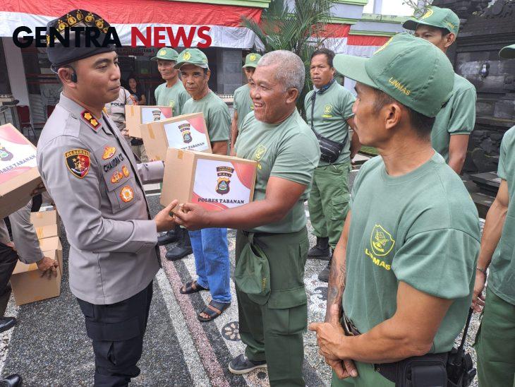 Tabanan, Dalam rangka meningkatkan solidaritas dan kepedulian terhadap aparat keamanan desa, Kapolres Tabanan, AKBP Chandra C. K., S.I.K., M.H., didampingi para PJU Polres Tabanan, saat Minggu Kasih, hari ini, Minggu ( 4/8/2024 ) menyerahkan paket sembako kepada anggota Linmas setempat.