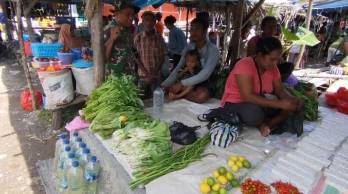 NTT-NAIKLIU – Babinsa Koramil 1604-03/Naikliu, Serda Deki Christian Tamelan melaksanakan komunikasi sosial atau komsos) sekaligus monitoring aktifitas masyarakat, di pasar tradisional Naikliu, Kelurahan Naikliu, Kecamatan Amfoang Utara, Rabu (9/4/2025).