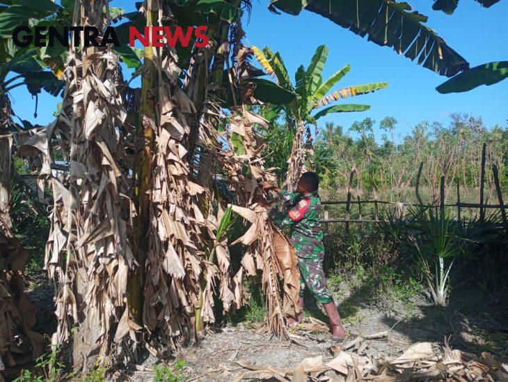 Gentra News NTT – KODIM 1605/BELU, Dalam mengoptimalkan pertumbuhan tanaman pisang yang ditanam oleh warga, Babinsa Desa Halibasar Serda Henry Rumamelete membantu membersihkan kebun pisang milik bapak Nori Edison Ton Warga Dusun Wekfau, Desa Halibasar, Kecamatan Wewiku, Kabupaten Malaka NTT, Sabtu (7/9/2024).