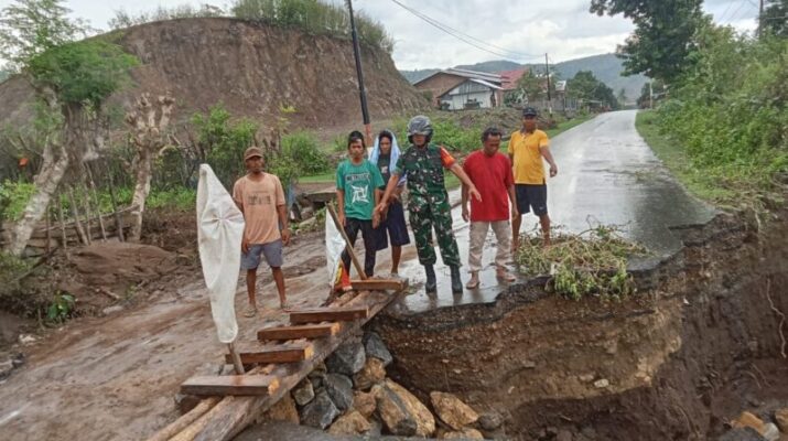 Babinsa Bersama Masyarakat Lakukan Kerja Bakti Perbaiki Akses Jembatan Rusak