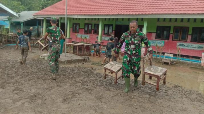 Selama kegiatan pembersihan, Pasiter turut memberikan semangat kepada semua pihak yang terlibat dan ikut serta langsung dalam membersihkan sisa-sisa banjir serta menyemprotkan air bersih untuk menghilangkan lumpur yang menempel pada ruangan-ruangan kelas tempat mengajar.