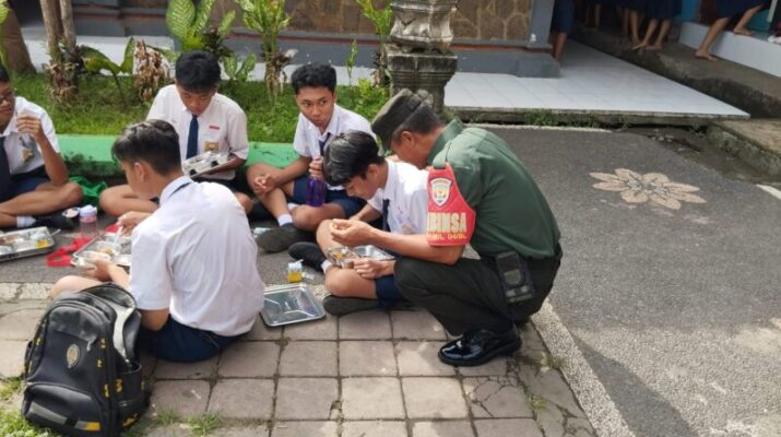 Gianyar – Dalam rangka mendukung program nasional makan bergizi gratis bagi siswa sekolah, Kapten Inf Cokorda Agung Semadi selaku Pasiter Kodim 1616/Gianyar bersama Babinsa Desa Keramas Sertu Nyoman Lancar menghadiri Launching Program Makan Bergizi Gratis (MBG) yang diselenggarakan oleh Satuan Pelayanan Pemenuhan Gizi (SPPG)/Dapur Sehat Desa Keramas. Kegiatan ini dilaksanakan di SMPN 2 Blahbatuh, Banjar Lebah, Desa Keramas, Kecamatan Blahbatuh, Kabupaten Gianyar, pada Senin (19/5/2025).