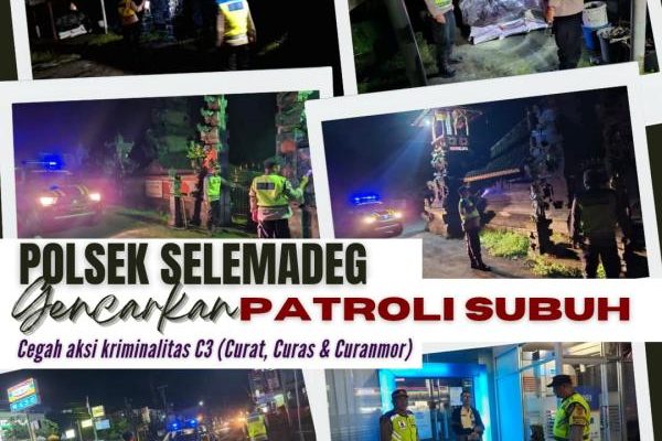 Gentra.co.id Bali – Polres Tabanan – Polsek Selemadeg, Sabtu, 25 Januari 2025, Pkl. 01:30 Wita. Dalam upaya menjaga keamanan wilayah, Polsek Selemadeg melaksanakan patroli Subuh guna mencegah aksi kriminalitas baik tindak pidana ringan (Tipiring) maupun tindak pidana C3 (Curat, Curas, Curanmor) dan antisipasi gangguan kamtibmas lainnya diwilayah hukum Polsek Selemadeg.