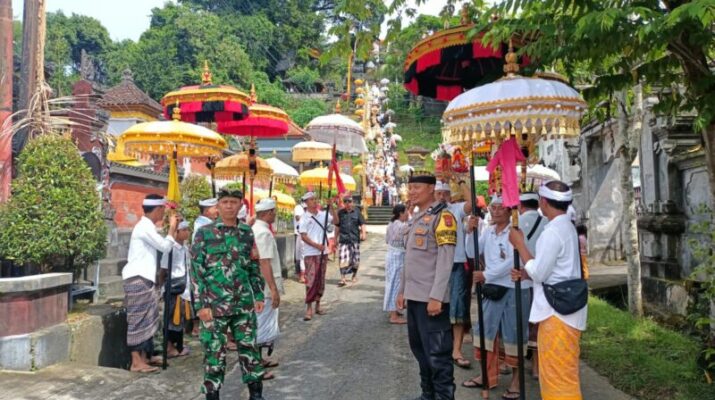 Gianyar – Samplangan, Minggu (30/11/2025) Ratusan warga mengikuti kegiatan tradisi adat Ngelungaang, Babinsa Kelurahan Samplangan Koramil 1616-01/Gianyar Serka I Komang Yudiartana bersama Bhabinkamtibmas Samplangan berkolaborasi dengan Pecalang Desa Adat Bukit Batu melaksanakan pengamanan serta pengaturan arus lalu lintas dalam rangka Ngiring Sesuhunan Pura Pucak Bukit Langkian dan Pura Dalem Desa Adat Bukit Batu menuju Pura Pucak Bukit Sari, Desa Adat Sidan, Gianyar.
