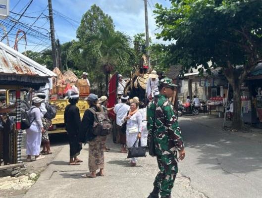 Gentra.co.id Bali  – Klungkung,- Koramil dan Polsek Nusa Penida bersama pecalang terus memberikan pengawalan dan pengamanan ketat berlangsungnya pujawali di Pura Penataran Dalem Ped, Minggu ( 26/01/2025 )