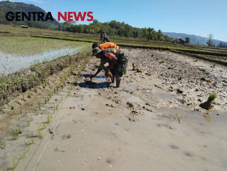 Gentra News NTT – KODIM 1605/BELU, Dalam upaya mendorong percepatan masa tanam untuk musim tanam ke 2, Babinsa Desa Lamaksanulu Koramil 1605-03/Weluli Sertu Fernando Machado mendampingi Kelompok Tani Gamal Hitu dalam menanam padi di lokasi sawah Dusun Builalu, Desa Lamaksanulu, Kecamatan Lamaknen, Kabupaten Belu NTT, Jumat (5/7/2024).