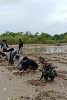 NTT-KUPANG,- Babinsa Kelurahan Oesapa Barat Koramil 1604-01/Kupang, Peltu Tomi J. Kurumbatu menghadiri aksi penanaman pohon mangrove bersama mahasiswa Universitas Cendana Kupang dan masyarakat sekitar Muara Abu. Kegiatan ini dilaksanakan dalam rangka memperingati Hari Ibu Tahun 2025 dengan mengusung tema “Bersinergi Bersama dalam Berdaya dan Berkarya.”Selasa (23/12/2025).