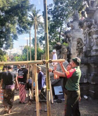 Bangli – Dalam rangka persiapan Piodalan Melaspas dan Rsi Gana di Pura Prajepati, Babinsa Desa Bunutin, Koramil 01/Bangli Kodim 1626/Bangli, Sertu Komang Yetrawan bersama Bhabinkamtibmas melaksanakan kegiatan Komunikasi Sosial (Komsos) sekaligus ngayah bersama warga di Banjar Dukuh, Desa Bunutin, Kecamatan/Kabupaten Bangli, Selasa (25/11/25).