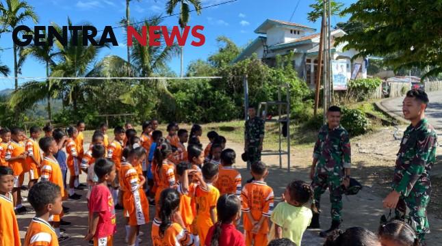 Selain melaksanakan tugas sebagai anggota satgas TMMD ke 121, Serka Made Dana Putra menyempatkan waktu untuk melatih para siswa melaksanakan PBB.