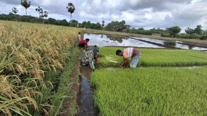 Babinsa Koramil 03/Pahunga Lodu Jajaran Kodim 1601/Sumba Timur Serma Yohanes Ratu Andung ikut mensukseskan program ketahanan pangan (Hanpangan) dengan membantu petani mencabut bibit padi di persawahan milik warga binaan di Desa Wulla, Kecamatan Wulla Waijelu, Kabupaten Sumba Timur, Sabtu (03/05/2025)