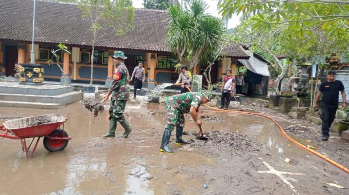 Material lumpur serta sampah yang terbawa banjir berserakan di areal sekolah SD N 6 Labuan Desa Antiga, agar tidak mengganggu kegiatan belajar mengajar kami bersama instansi terkait melaksanakan gotong royong pembersihan, terang Personel Koramil 1623-05/Manggis Serka I Gede Suardika.
