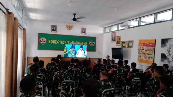 Seluruh personel militer Kodim 1623/Karangasem dipimpin Kasdim Mayor Inf. Dewa Putu Oka melaksanakan nonton bersama secara virtual, di Aula Kodim 1623/Karangasem Jln.Sudirman Kel.Subagan Kec/Kab.Karangasem, pada Minggu (05/10/25).