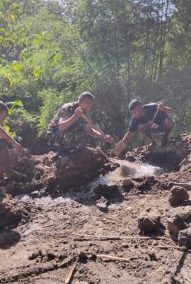 Flotim – Babinsa Koramil 1624-06/Wulanggitang Praka Primus Lake bersama warga Dusun Klobong, Desa Boru, melaksanakan kegiatan gotong royong memperbaiki pipa air bersih yang patah akibat galian proyek jalan pada Selasa (02/12/2025).