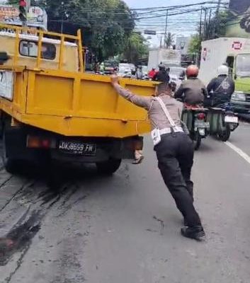 Aiptu Suastika mengatakan dirinya membantu mendorong truck tersebut agar tidak terjadi kemacetan. “Saat melakukan pengaturan lalu lintas di sana saya melihat truck itu tiba-tiba mogok dan berhenti di tengah jalan. Agar tidak terjadi kemacetan langsung membantu sopirnya mendorong ke tepi jalan,” ucap Aiptu Suastika.