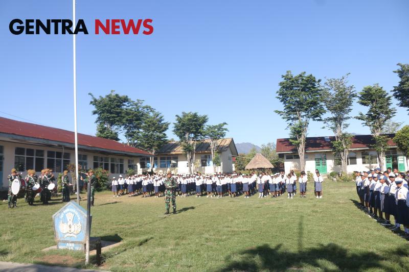 Satgas Pamtas RI-RDTL Sektor Barat Yonarhanud 15/DBY Melaksanakan Upacara Bendera Keliling Sekolah