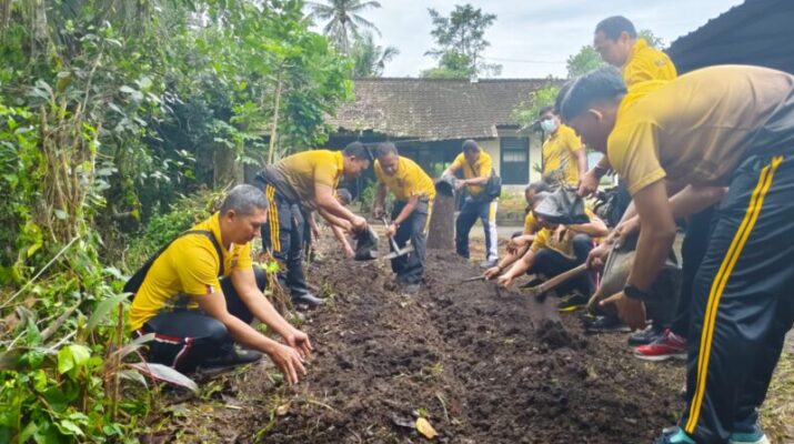 Polres Tabanan-Polsek Kerambitan, Sabtu Mei 24 Mei 2025; Kapolsek Kerambitan Akp I Putu Budiawan didampingi Wakapolsek Kerambitan I Gst Kt Suarcana memimpin langsung kegiatan pembuatan bedengan untuk tanaman bergisi di pekarangan Mapolsek Kerambitan.